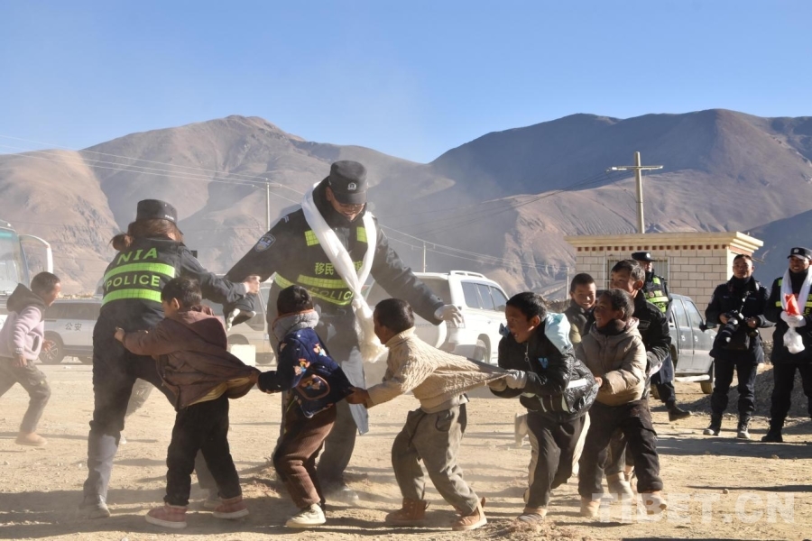 圖為在日喀則市定日縣長所鄉(xiāng)雜村安置點,移民管理警察和小朋友玩老鷹捉小雞游戲 攝影:卿光強
