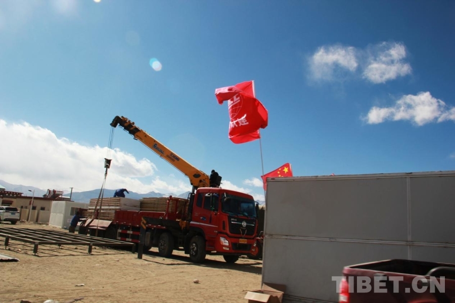 圖為工作人員正在長所鄉(xiāng)森嘎村卸新運(yùn)到的板房 攝影:劉莉