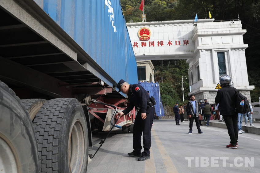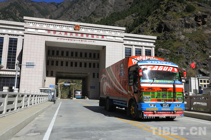 圖為尼泊爾貨車(chē)從吉隆口岸國(guó)門(mén)經(jīng)過(guò) 攝影:肖富貴