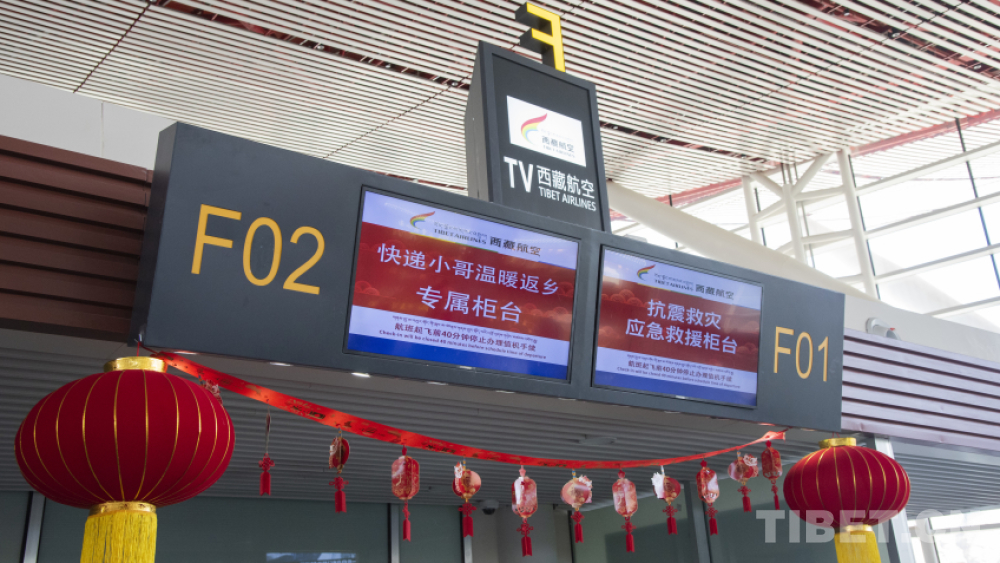 圖為西藏航空開(kāi)設(shè)的快遞小哥溫暖返鄉(xiāng)專(zhuān)屬柜臺(tái)和抗震救災(zāi)應(yīng)急救援柜臺(tái) 攝影:趙振宇