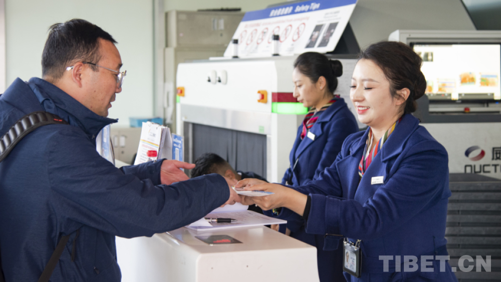 “您好,先生,請(qǐng)問(wèn)您乘坐藏航哪趟航班?請(qǐng)出示您的身份證。您有托運(yùn)行李嗎?托運(yùn)行李中有鋰電池、充電寶嗎?這些是不能托運(yùn)的,只能隨身攜帶。請(qǐng)拿好您的登機(jī)牌。再見(jiàn),祝您歸途愉快!”1月25日,記者在拉薩貢嘎國(guó)際機(jī)場(chǎng)T3航站樓G島柜臺(tái),見(jiàn)到了西藏航空公司拉薩基地值機(jī)服務(wù)隊(duì)隊(duì)長(zhǎng)次仁卓嘎。
