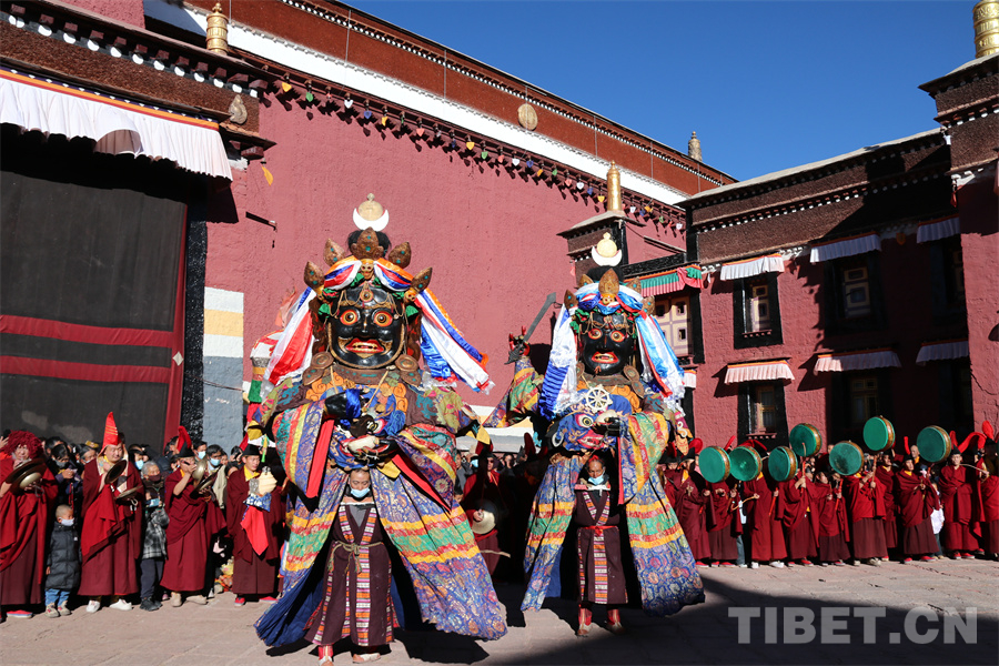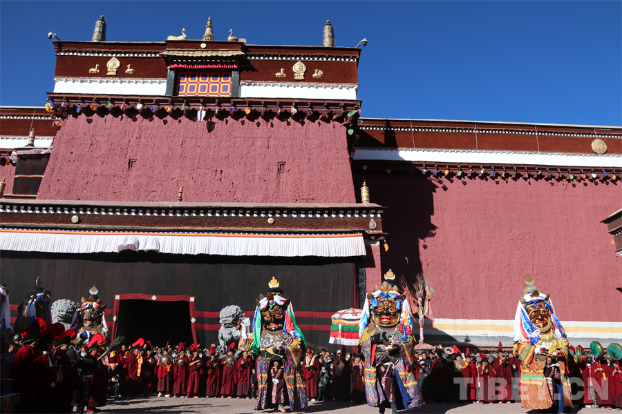 圖為從各處迎請出的大黑天等神像在薩迦寺院內(nèi)廣場匯合,跳金剛舞 攝影:王妍丹