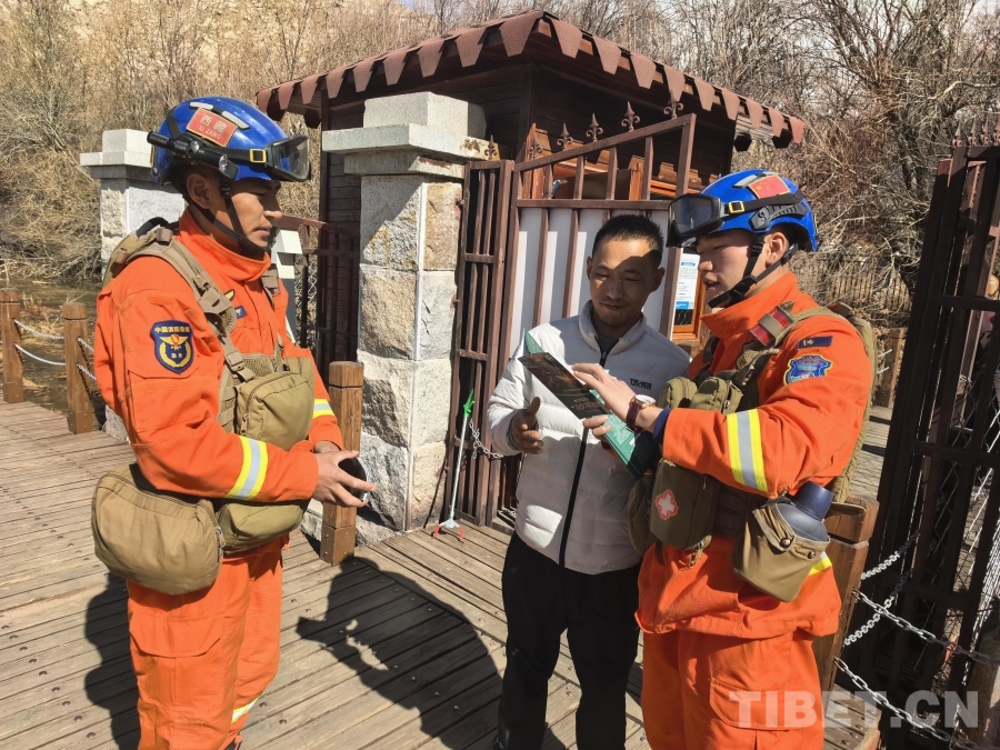 圖為西藏森林消防總隊(duì)特勤大隊(duì)指戰(zhàn)員在拉魯濕地向來(lái)往市民游客普及防火知識(shí)