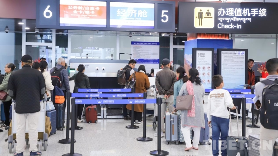 圖為乘坐拉薩至博卡拉首飛航班的旅客正在辦理值機(jī)手續(xù) 攝影:賈華加