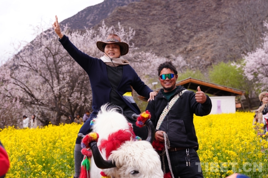 圖為游客在嘎拉桃花源里騎牦牛拍照 攝影:德吉卓瑪
