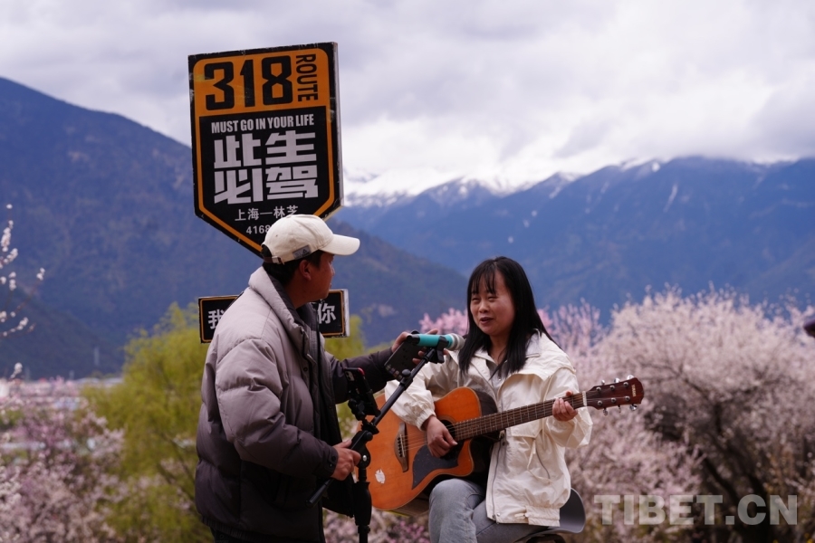 桃花樹下,沿著階梯往觀景臺(tái)方向走去,“此生必駕318”打卡路牌十分醒目,游客坐在一旁的座椅上拿起吉他,對(duì)著話筒深情歌唱,遠(yuǎn)處皚皚雪山與茂密的森林,近處粉白相間的桃花和金燦燦的油菜花構(gòu)成一幅壯美畫卷,讓游客沉醉在歌聲與美景中,苑寶錄正忙著將這一瞬間拍攝記錄。
