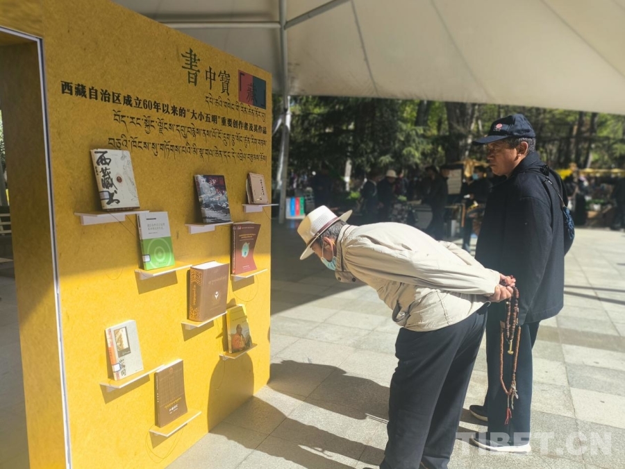圖為4月19日,第二屆“拉薩春日書會(huì)”主會(huì)場(chǎng)宗角祿康公園內(nèi),市民駐足觀看書籍作品陳列 攝影:趙釗