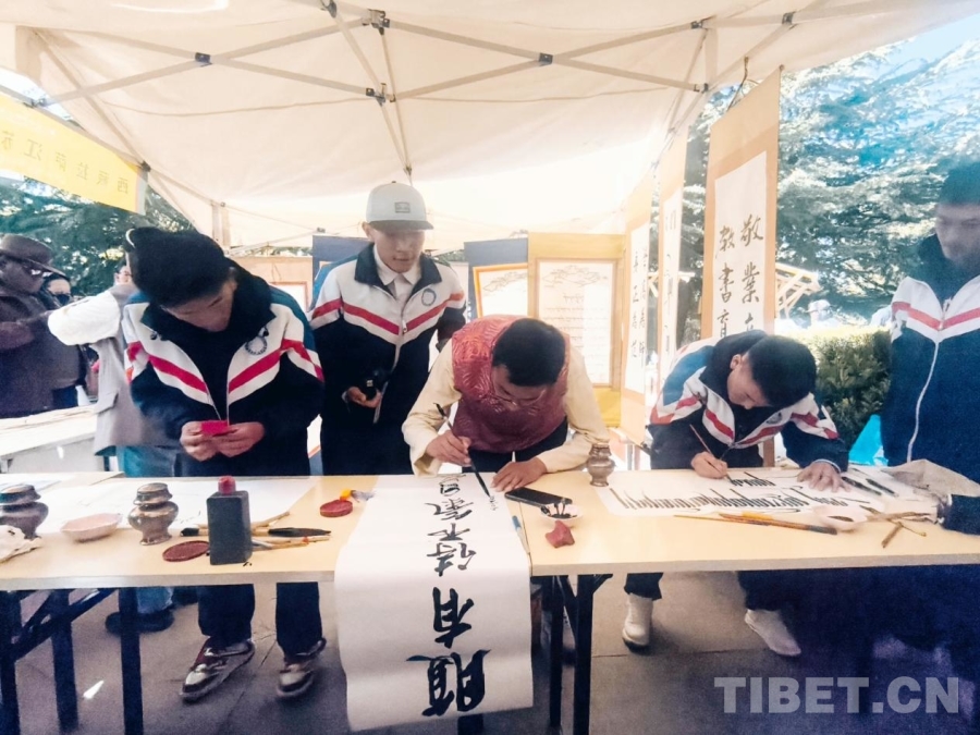 圖為4月19日,第二屆“拉薩春日書會(huì)”宗角祿康公園主會(huì)場(chǎng)內(nèi),拉薩江蘇實(shí)驗(yàn)中學(xué)書法社的同學(xué)們?cè)谧珜憰ㄗ髌?攝影:趙釗