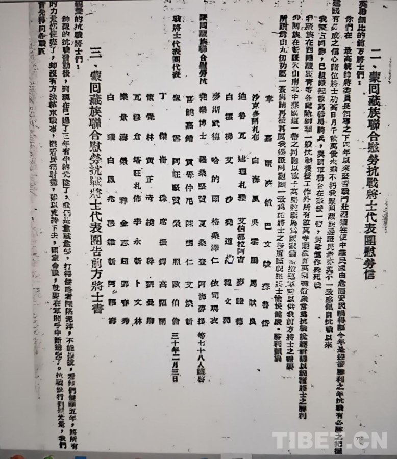 撫今追昔,再讀1941年2月由蒙、回、藏等各民族代表(藏族代表有喜饒嘉措、阿旺堅贊、貢覺仲尼、羅桑堅贊、格桑澤仁、丁杰、倫珠、策覺林、黃正清、劉曼卿、鄧春秀、繞干等)聯(lián)署的《蒙回藏族聯(lián)合慰勞抗戰(zhàn)將士代表團告前方將士書》(以下簡稱《告前方將士書》)(原擬赴各戰(zhàn)區(qū)慰問前線將士,因交通關系,未能成行),深感它不僅是一封跨越地理阻隔的致敬信,更是一曲蕩氣回腸的民族精神交響曲。當我們將目光聚焦于這份文獻本身,會發(fā)現(xiàn)其中蘊含的精神力量至今仍在激蕩。