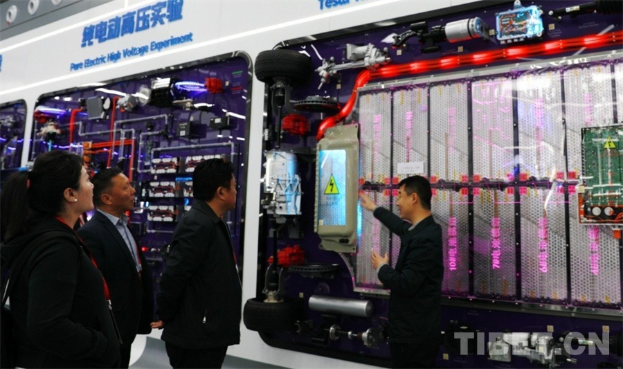 “這是由7104節(jié)電池組成的特斯拉的電池組,它是402伏的高壓電。所以,沒有經(jīng)過專業(yè)培訓(xùn)進行電動汽車維修會有一定的危險性?!北狈絿H汽車教育展廳、車間負責(zé)人黨超為到訪的西藏自治區(qū)工商聯(lián)民營企業(yè)家赴京學(xué)習(xí)參觀團一行詳細介紹著墻上展示的電池組。大家聽得津津有味。