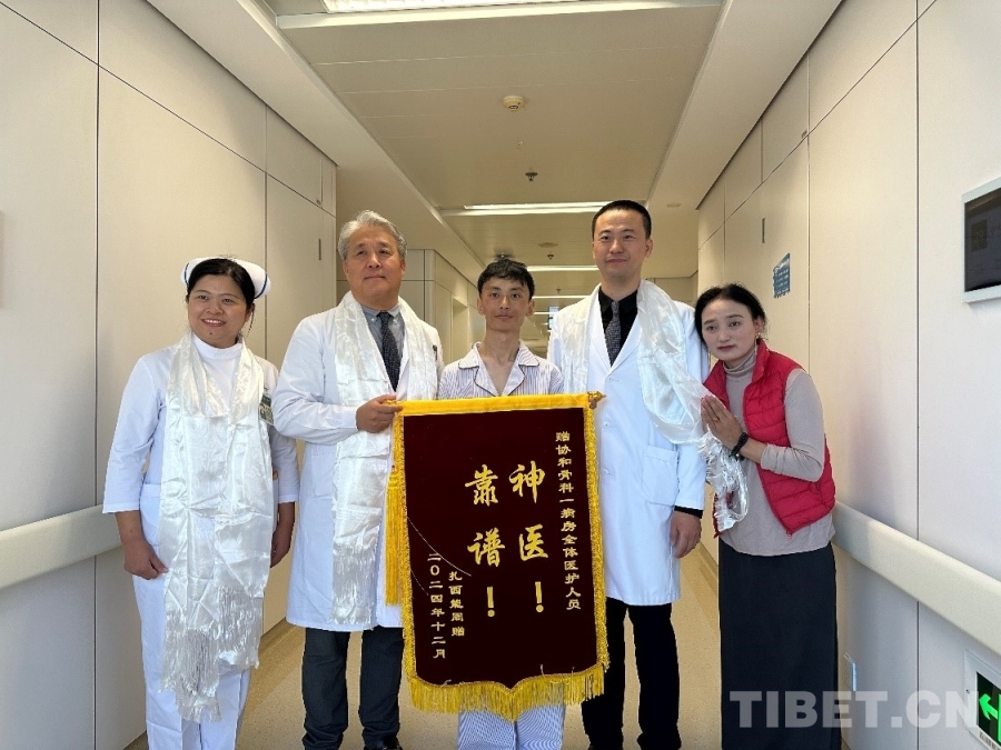 圖為受到救助的藏族患者向北京協(xié)和醫(yī)院骨科醫(yī)療團(tuán)隊(duì)贈送錦旗 攝影:楊眉笑