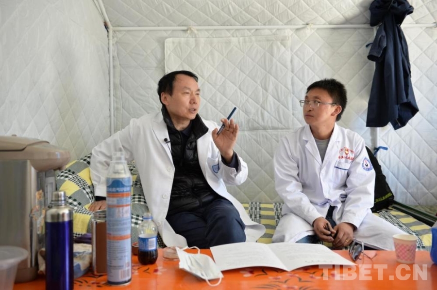 圖為2021年,余震中,王建六(左)帶領團隊赴青海省瑪多縣開展宮頸癌篩查,在帳篷辦公室里與當?shù)蒯t(yī)務工作者交流 北京同心共鑄公益基金會供圖