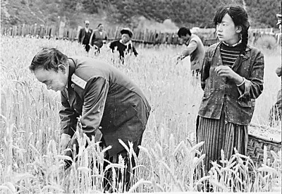 1990年,陰法唐乘汽車(chē)從青藏公路赴西藏,途中和群眾收割青稞。