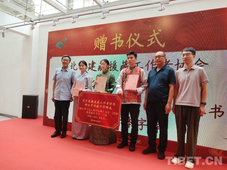圖為北京建藏援藏工作者協(xié)會(huì)副會(huì)長(zhǎng)高揚(yáng)、唐召明與民盟中央宣傳委副主任蔡詩(shī)章共同向北京西藏中學(xué)捐贈(zèng)叢書 攝影:王東