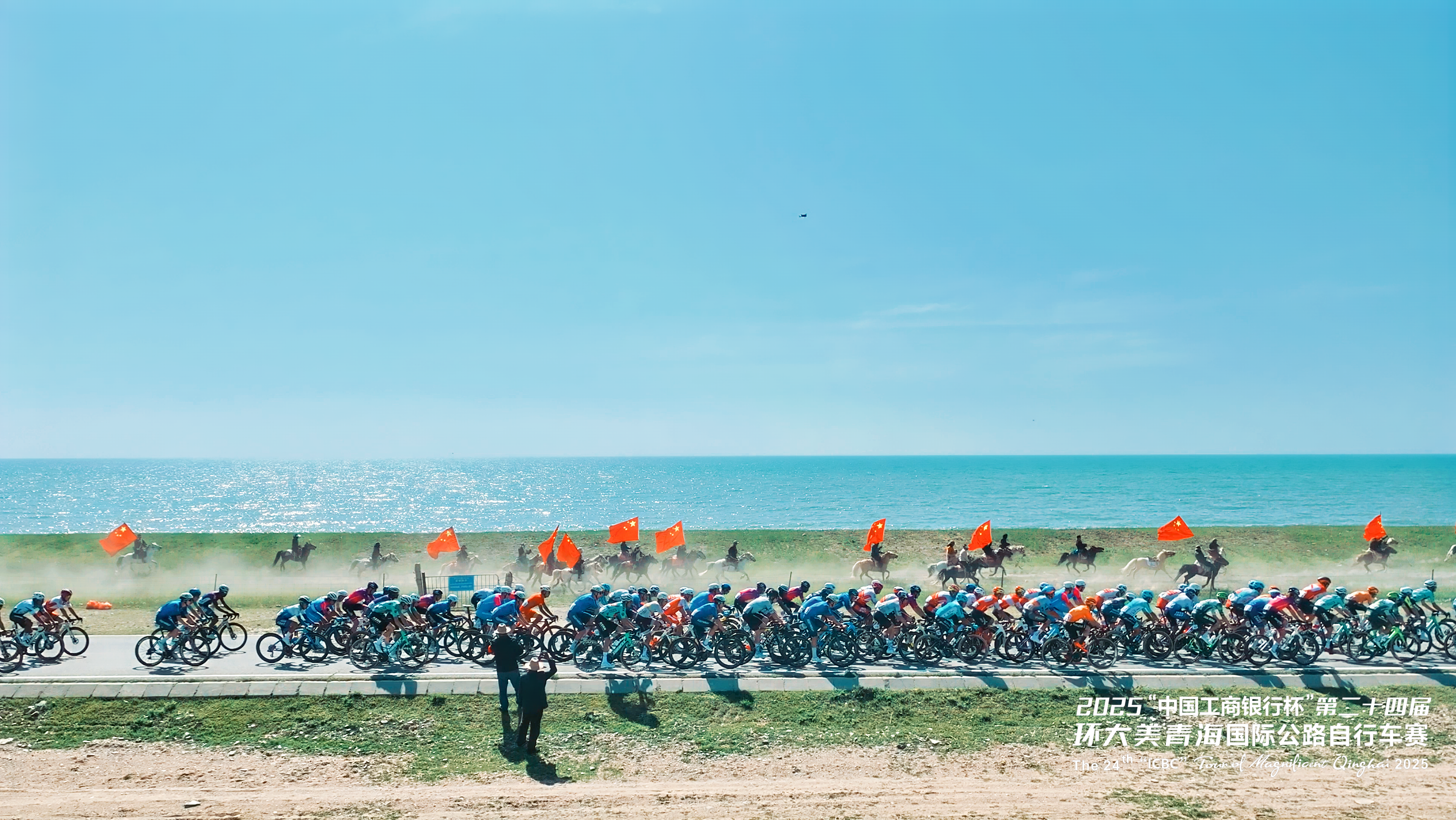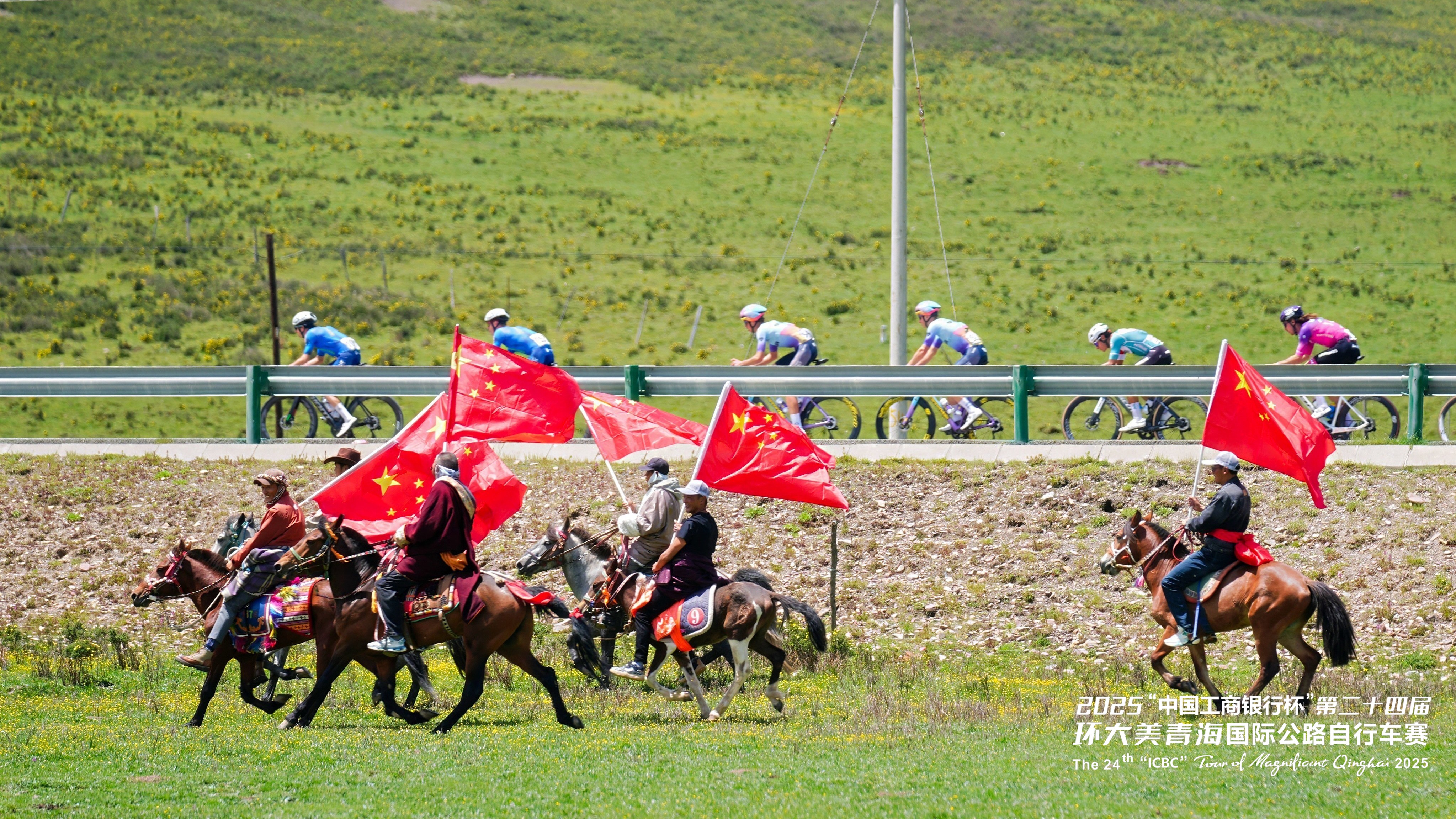 在青海湖畔,牧民們手擎國旗策馬飛馳,與選手們并肩競逐。這一場景也致敬了全球頂尖自行車賽事環(huán)法自行車賽中自行車與馬匹同行的經(jīng)典畫面——騎馬承載著人類悠久的出行記憶,自行車則象征著現(xiàn)代的綠色出行理念,此刻,在青海湖畔,傳統(tǒng)與現(xiàn)代完美交融,共同譜寫著人與自然和諧共處的動人篇章。