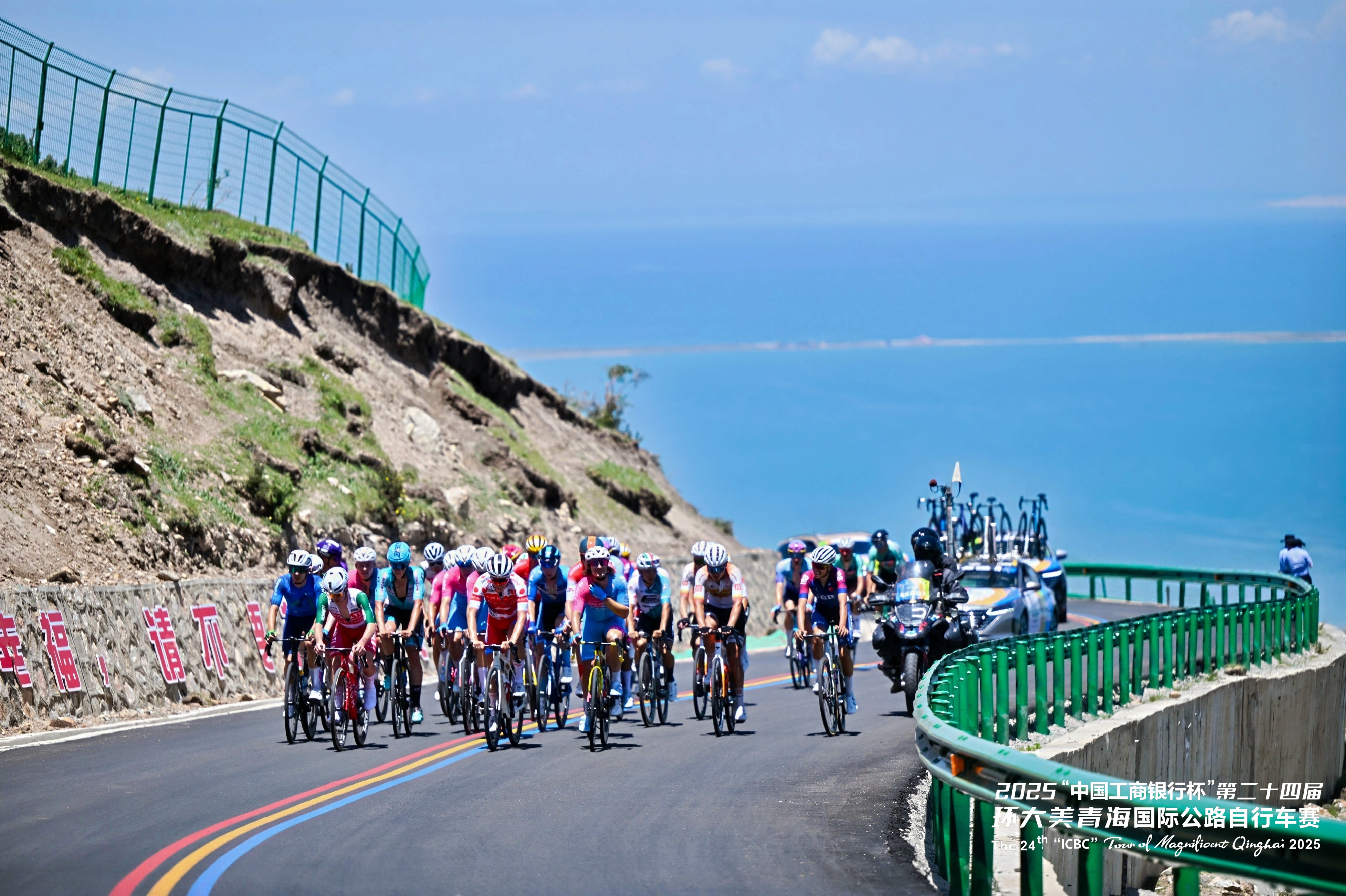 第二十四屆環(huán)青賽第七賽段——共和-海晏賽段。賽段經(jīng)過海拔約3740米的洛合埡口,居高臨下,以近乎180度的角度俯瞰青海湖,將湖面、山巒、草原盡收眼底。