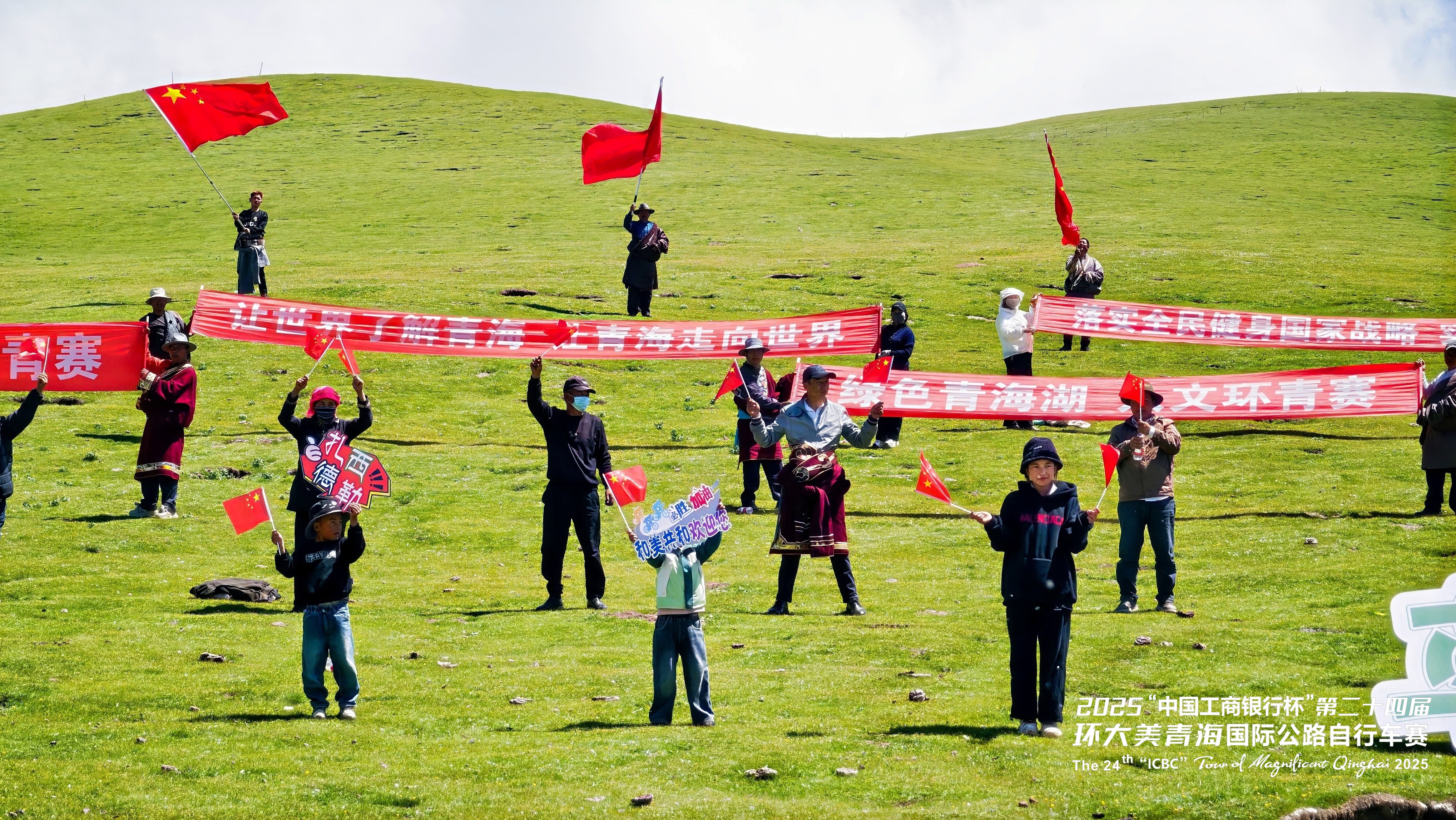 圖為環(huán)青賽期間,沿途的群眾、小朋友們手持“讓世界了解青海 讓青海走向世界”“綠色青海湖 人文環(huán)青賽”等標(biāo)語的橫幅,用燦爛的笑容和真摯的歡呼,向世界展示著青海人民的開放與好客,飄揚的橫幅與歡呼聲交織,傳遞出這片土地對八方來客最熱烈的歡迎。