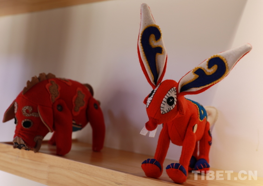 圖為夏扎大院里的“卓番林·措瓦”店陳列的手工十二生肖系列玩偶豬與兔 攝影:劉莉