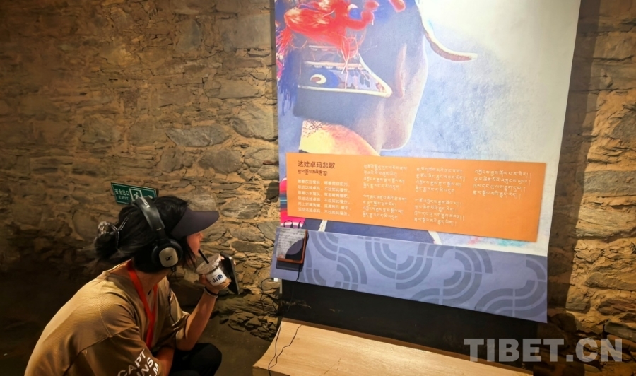 圖為游客參觀強(qiáng)吉莊園公共文化活動中心時通過影音設(shè)備聆聽歌曲《達(dá)娃卓瑪悲歌》 攝影:劉莉