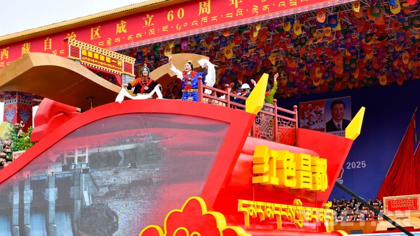 昌都市彩車,以“西藏第一面五星紅旗升起的地方”“西藏解放第一村”為基調(diào),紅色印記格外醒目?!凹t色昌都”彩車,車體以紅旗為主線勾勒輪廓,承載著雪域兒女對(duì)西藏60年輝煌成就的深情禮贊。