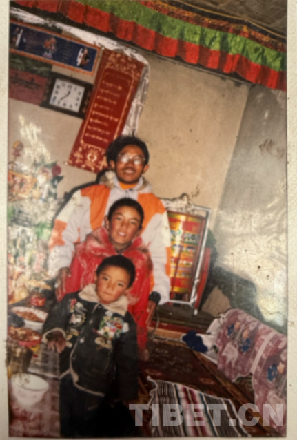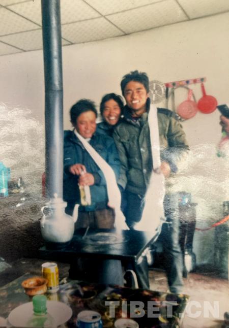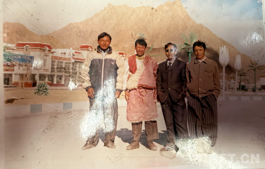 這是九十年代在阿里拍的,拍攝地點是現(xiàn)在的康樂新區(qū)。從照片上可以看到,那時候阿里建設得挺好。右邊第一個穿燈籠褲的是我。這種褲子當時特別流行,年輕小伙子們穿上可高興了。穿藏袍的是我弟弟,那時他還是個普通牧民,后來通過自己的努力,已經(jīng)是我們的村長了。戴墨鏡的是我們同村的,開車時和人發(fā)生沖突打壞了眼睛,去內(nèi)地治療花了十多萬。后來因為眼睛問題駕照被注銷,也就沒辦法繼續(xù)開車了,現(xiàn)在在拉薩當保安。當時他正好在阿里開出租車,我們找到他一起拍了這張照片。左邊的大個子現(xiàn)在開了個商店和茶館,生意不錯。