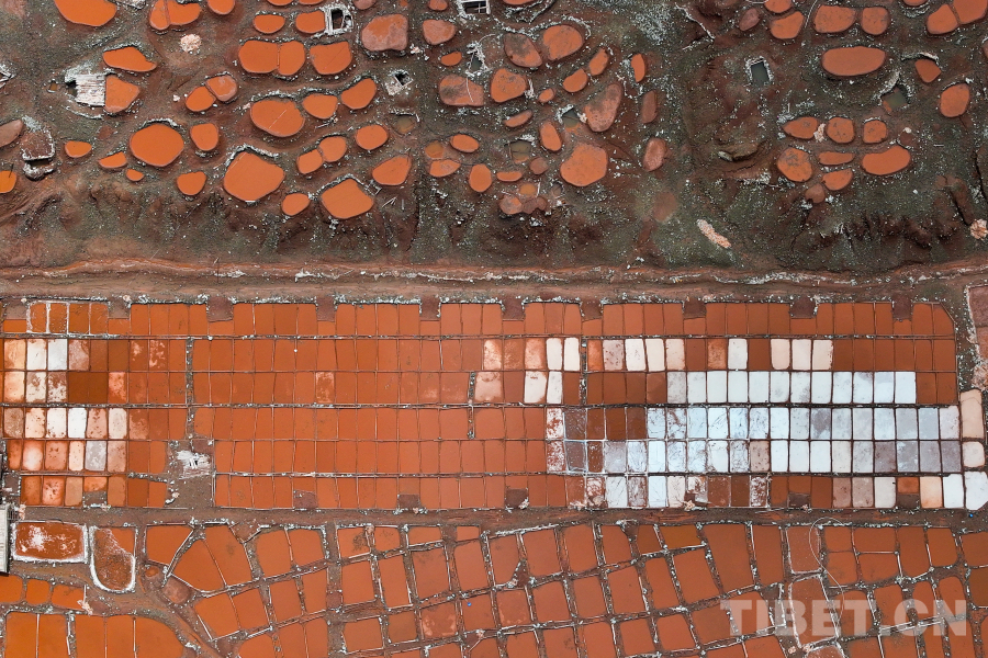 圖為航拍白扎鹽場(chǎng),這種紅褐色的顏色來(lái)自附近山體中所含的礦物質(zhì) 攝影:薛蒂