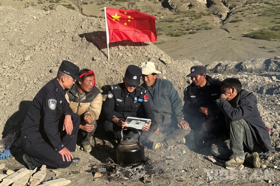 圖為日喀則邊境管理支隊薩嘎邊境管理大隊昌果邊境派出所民警在海拔5300米的拉孜加久山口巡邏間隙與護邊員共同收看紀念中國人民抗日戰(zhàn)爭暨世界反法西斯戰(zhàn)爭勝利80周年大會 攝影:旦增扎巴
