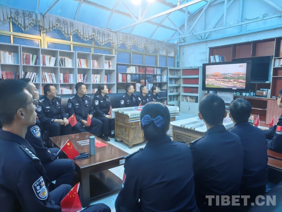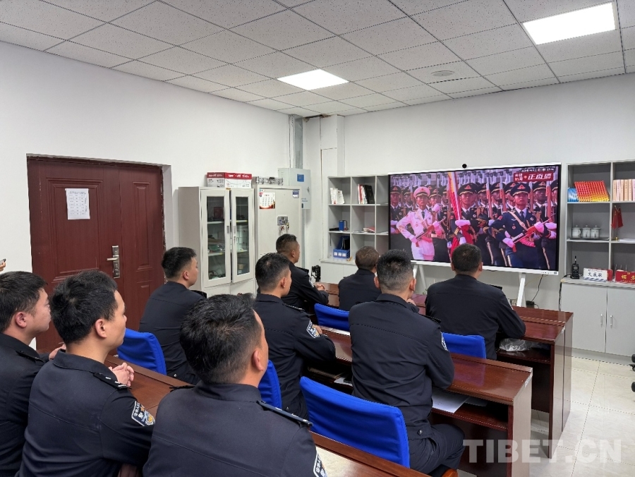 圖為日喀則邊境管理支隊康布邊境派出所組織全體民警觀看紀念中國人民抗日戰(zhàn)爭暨世界反法西斯戰(zhàn)爭勝利80周年大會 攝影:周偉