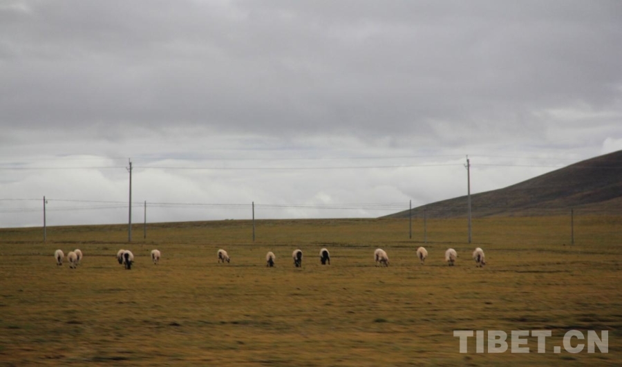 圖為從班戈到雙湖的路兩邊有大片草場(chǎng),牛羊在悠閑吃草 攝影:趙釗