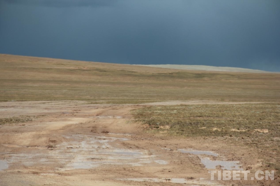 無人區(qū)的天氣是片段式的,前腳還晴著,下步走進(jìn)一塊雨云下,車子就又會(huì)被淋個(gè)透。我們的車就中招了,在一片黑云壓頂后,刷刷的小雨下了起來,不久又變成了冰雹。小小的冰塊砸在路上融化,很快就把干的泥土裹了起來,路上頓時(shí)變得泥濘不堪。如果說石子路的顆粒感顛得人頭暈,那么雨后泥路就黏黏糊糊的,車子仿佛在浸滿水的海綿上走,快不了,也起不來。漸漸地,雨水大起來,漸漸匯成小溪,車輛駛過,又是一片水花四濺。