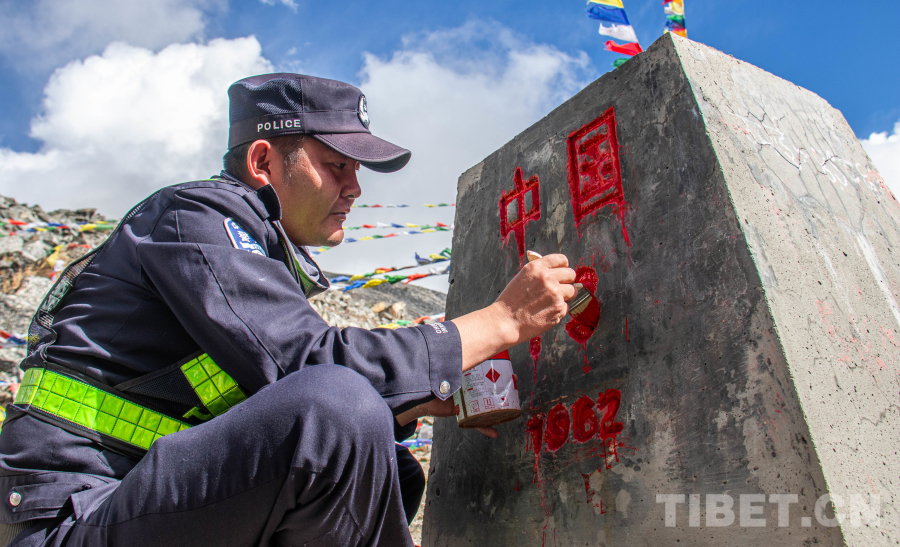 圖為日喀則邊境管理支隊(duì)霍爾巴邊境派出所民警為紀(jì)念中國(guó)人民抗日戰(zhàn)爭(zhēng)暨世界反法西斯戰(zhàn)爭(zhēng)勝利80周年開展界碑描紅 攝影:楊承旭
