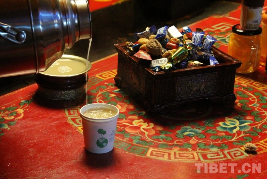 圖為尼瑪家的藏式桌幾上擺著酥油茶、牦牛肉和各色糖果 攝影:趙釗