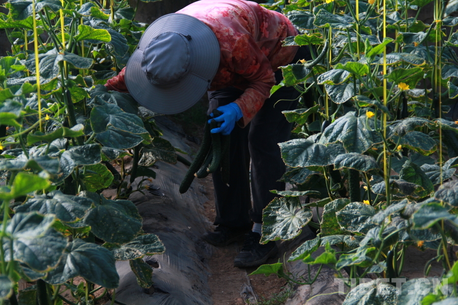 圖為陜西技術(shù)員李伍女在采摘黃瓜 攝影:趙釗
