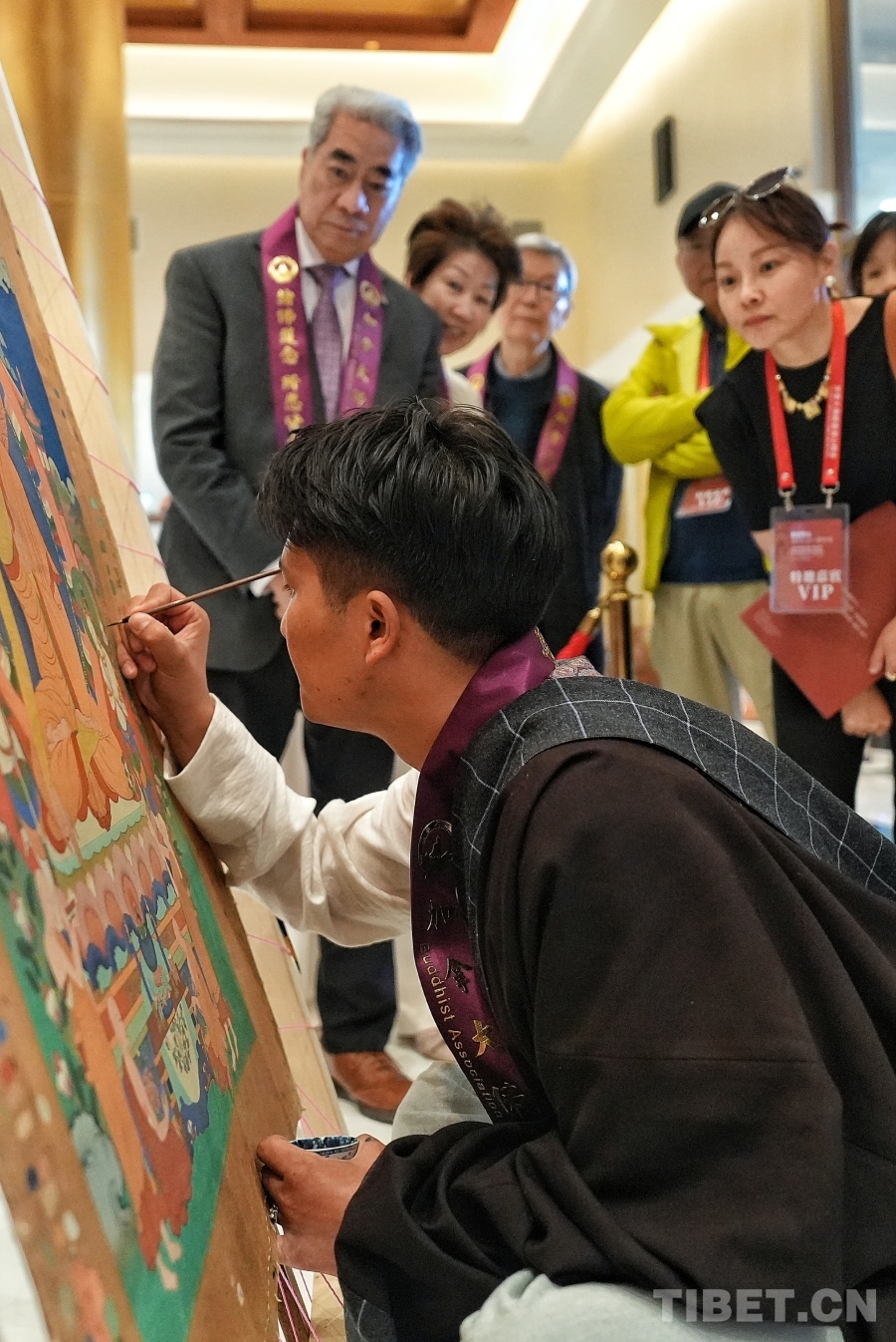 為了提升觀展體驗(yàn),展覽特別設(shè)置了“唐卡技藝現(xiàn)場(chǎng)演示”環(huán)節(jié)。壤巴拉非遺傳習(xí)協(xié)會(huì)青年藝術(shù)家申支足現(xiàn)場(chǎng)展示傳統(tǒng)唐卡繪制過(guò)程,他專(zhuān)注而細(xì)膩的筆觸,讓觀眾得以近距離觀察到非遺技藝的“匠心細(xì)節(jié)”,直觀感受每一幅作品背后所沉淀的時(shí)間與文化心血,從而更深入地理解中國(guó)優(yōu)秀傳統(tǒng)藝術(shù)的創(chuàng)作邏輯。