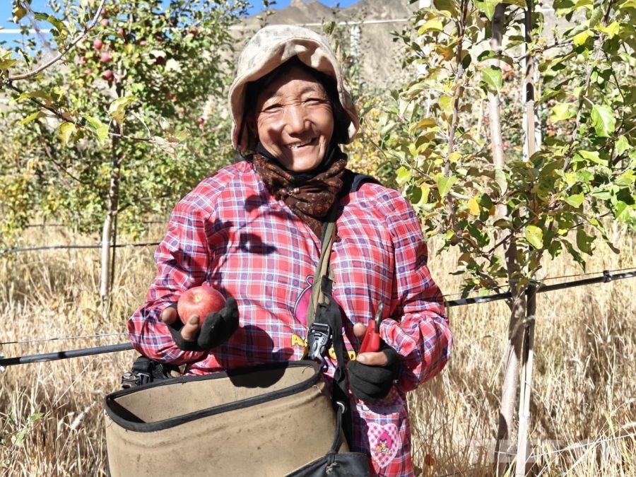 圖為山南市貢嘎縣吉雄鎮(zhèn)劉瓊村的村民次尼在貢嘎縣矮化蘋(píng)果種植項(xiàng)目基地,向記者鏡頭展示其在家門(mén)口就業(yè)的喜悅之情