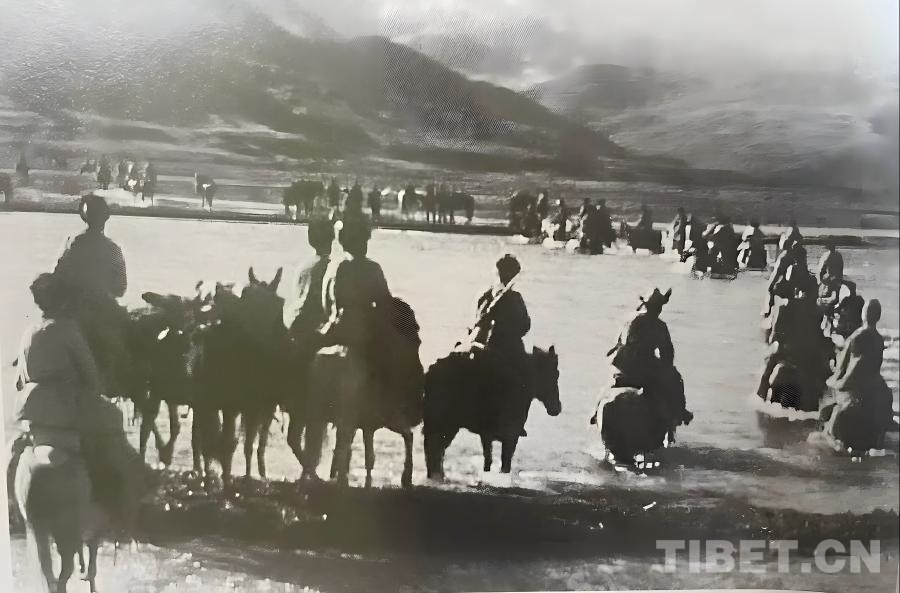 圖為1952年,米福堂精心組織力量,幫助十世班禪和護(hù)送部隊(duì)在通天河七渡口渡過長(zhǎng)江