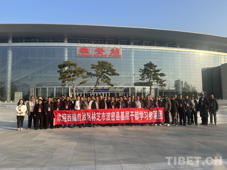圖為西藏自治區(qū)林芝市波密縣基層干部學(xué)習(xí)參觀團(tuán)在高鐵雄安站前合影 攝影:李文治