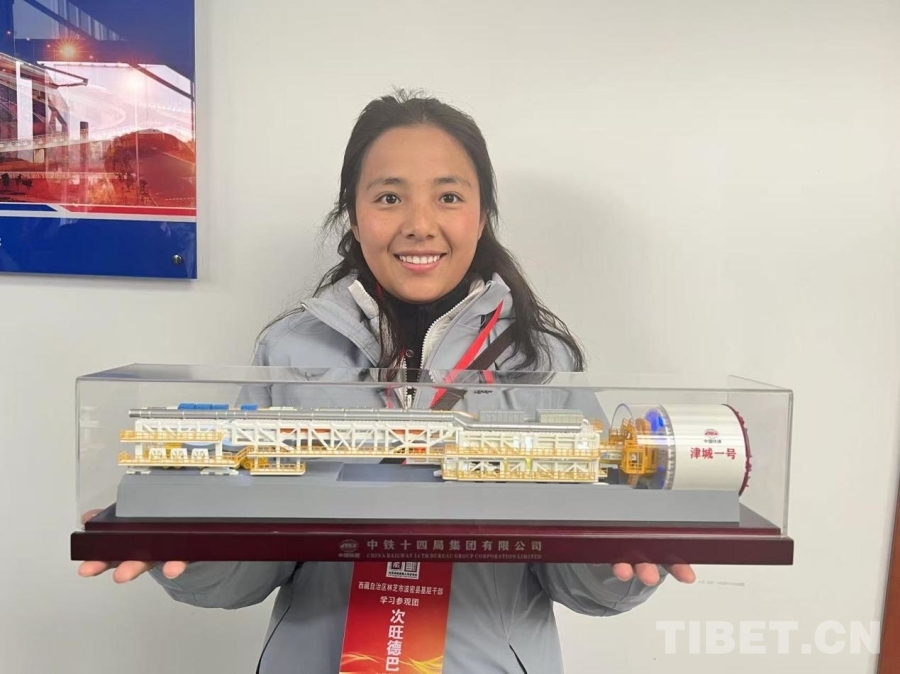 圖為西藏基層干部學習參觀團領隊次旺德巴展示“津城一號”盾構機模型 攝影:王茜