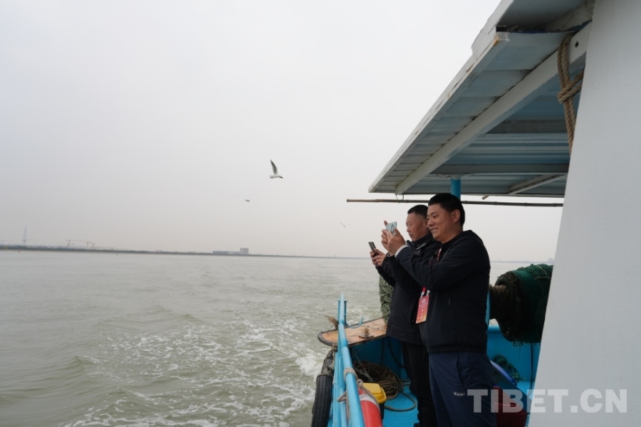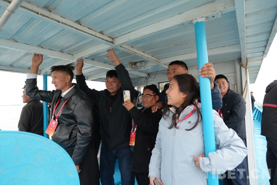 圖為西藏基層干部學習參觀團成員在甲板上觀看捕魚 攝影:王茜