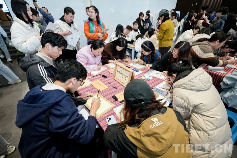 圖為學(xué)生正在體驗藏文書法