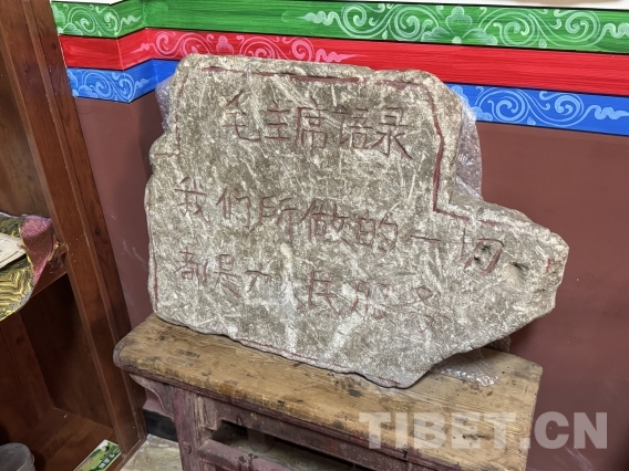 如今,松安寺內(nèi)有一座專門設(shè)立的紅色文物陳列室,長青介紹道,這座紅色文物陳列室是現(xiàn)任活佛羅讓甲央在當(dāng)?shù)卣С窒禄I建而成。陳列室廣泛收集了有關(guān)紅色文物進(jìn)行集中展示,供僧眾和信教群眾參觀學(xué)習(xí)。有一塊石刻被視為“鎮(zhèn)館之寶”,上面刻著毛主席的語錄“我們所做的一切都是為人民服務(wù)”。石刻是寺廟在維修僧房時(shí)從房基下發(fā)現(xiàn)而挖出的,年代久遠(yuǎn),也見證了歷史里精神的傳承。