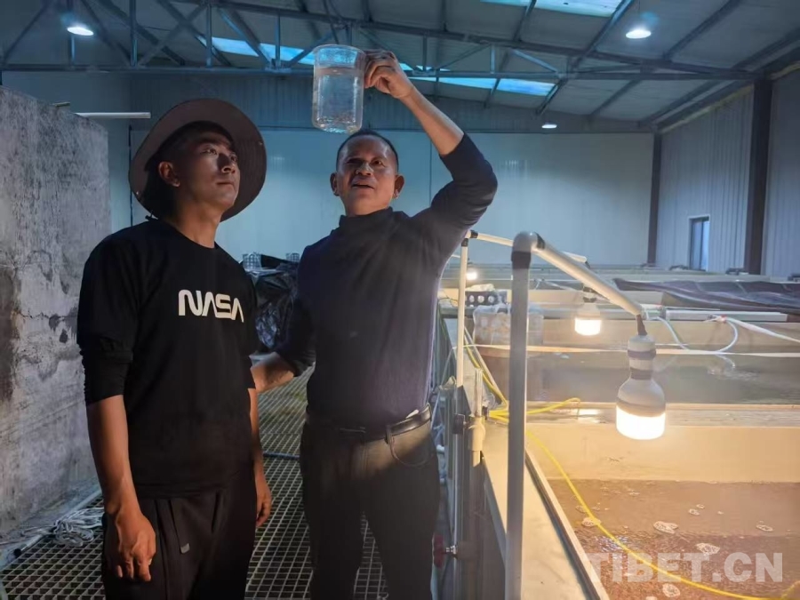 圖為駱明飛(右)帶徒弟尼瑪旺堆學(xué)習(xí)如何科學(xué)觀察魚苗的繁育過程 受訪者供圖
