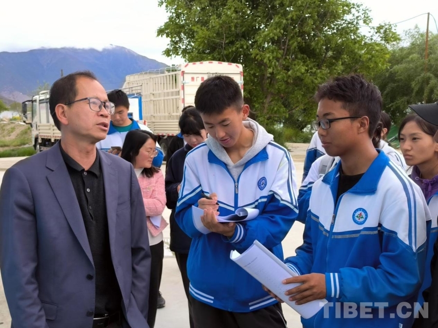 圖為駱明飛(左一)為林芝一中學(xué)生科普高原漁業(yè)知識(shí) 受訪者供圖