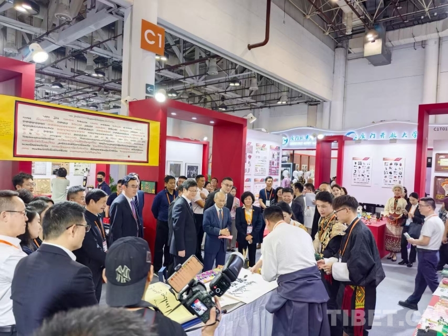 圖為西藏民族大學扎西曲吉參加第十六屆海峽兩岸(廈門)文化產(chǎn)業(yè)博覽交易會,現(xiàn)場書寫“團結(jié)統(tǒng)一”的漢藏雙語書法作品并做講解