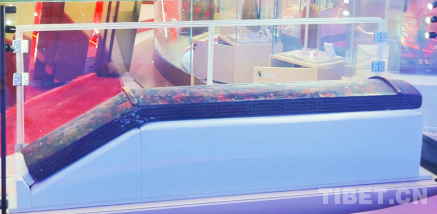 我們看到,雖然歷經(jīng)千年,琴與長鼓仍色澤鮮艷,保存完好。整體呈亞腰形,兩端配備皮帶,可系于腰間,長鼓中間最細窄之處可系繩便于安置在樂器架上。其表面精巧地髹飾著朱漆與黑漆,巧妙地描繪出寶相牡丹花、云頭紋和火焰紋。而擁有同樣花紋的木琴一端斜下折出鈍角,更見巧思。雖然木琴兩道岳山間原本的琴弦因年代久遠沒有了,但我們?nèi)苑路鹉芟胂蟮?,入藏后的演奏中,琴弦聲聲,有長安的溫婉綿長,也含雪域的雄渾遼闊,鼓聲陣陣,中原的節(jié)奏與雪域的韻律交織,和鳴穿越時空,在當下奏出和諧樂章。這兩件公主的嫁妝,早已不是單純的器物,更承載著深厚的歷史文化底蘊,成為民族文化交融的鮮活注腳。