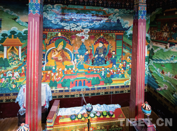 圖為五世達賴喇嘛故居內(nèi)的壁畫——清順治皇帝接見五世達賴喇嘛