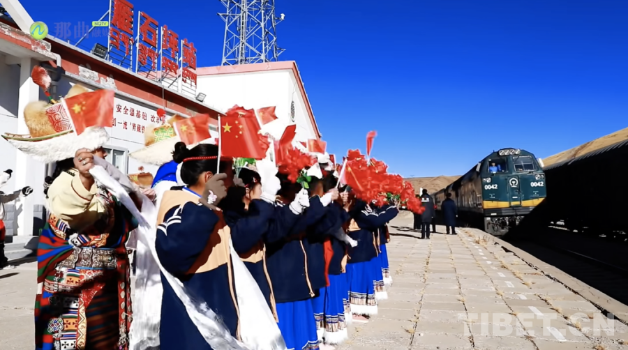 圖為Z9817次列車駛?cè)胙闶撼私邓?圖源:那曲融媒
