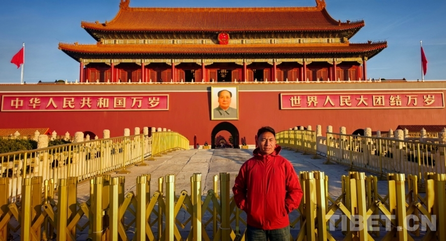 圖為西藏自治區(qū)那曲市色尼區(qū)青少年足球隊(duì)中場(chǎng)球員多杰頓桑在天安門廣場(chǎng)與國旗合影 攝影:劉莉
