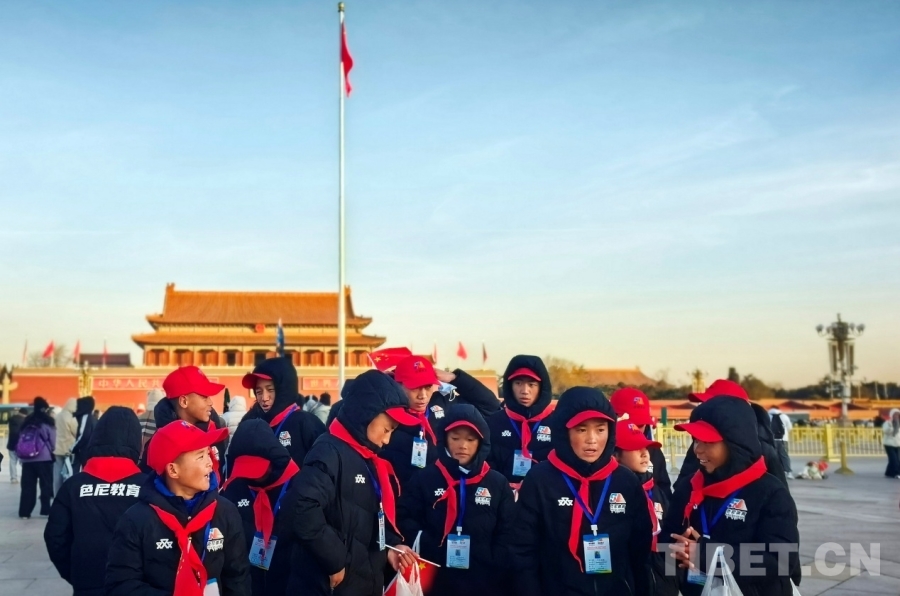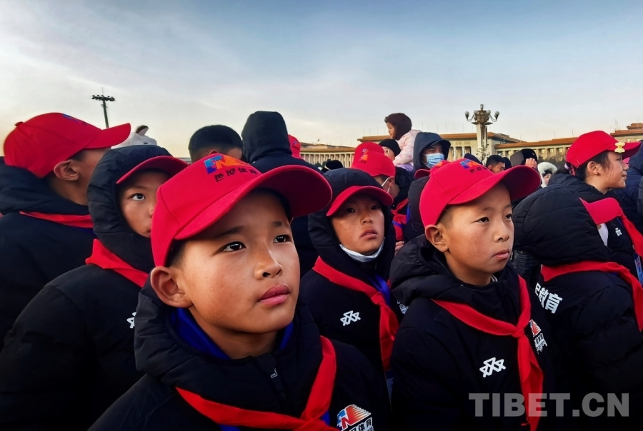 圖為西藏自治區(qū)那曲市色尼區(qū)青少年足球隊(duì)左邊鋒羅布占堆(前排左一)在天安門廣場(chǎng)觀看升旗儀式 攝影:劉莉