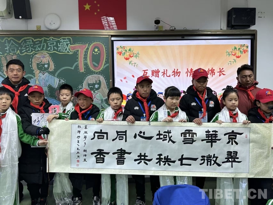 圖為京藏兩地的同學(xué)們互贈(zèng)禮物合影留念 攝影:楊眉笑